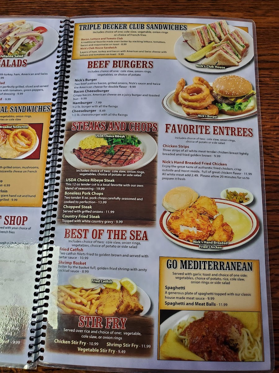 Don't miss out on the Sweet Endings menu, featuring delicious ice cream sundaes and milkshakes to satisfy your sweet tooth. Patrons like Don Jones rave about the generous portions and attentive, friendly service, making each visit a memorable experience. With a commitment to quality and a warm atmosphere, Nick’s truly stands out.